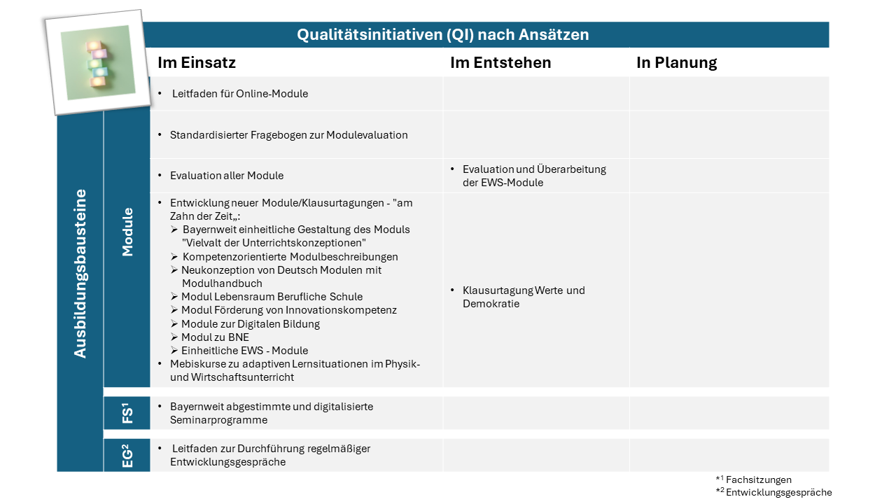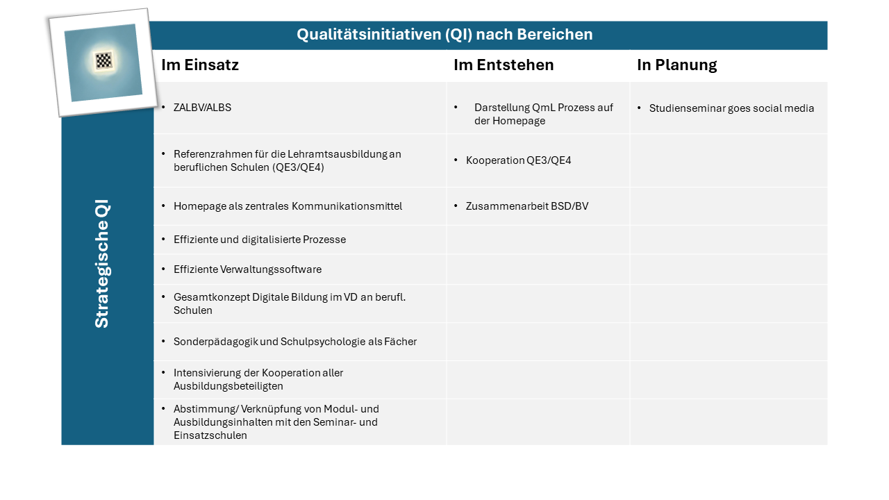 Nachfolgend finden Sie unsere Qualitätsinitiativen (QI) eingeteilt nach verschiedenen Bereichen. Viel Spaß beim Stöbern! 😊